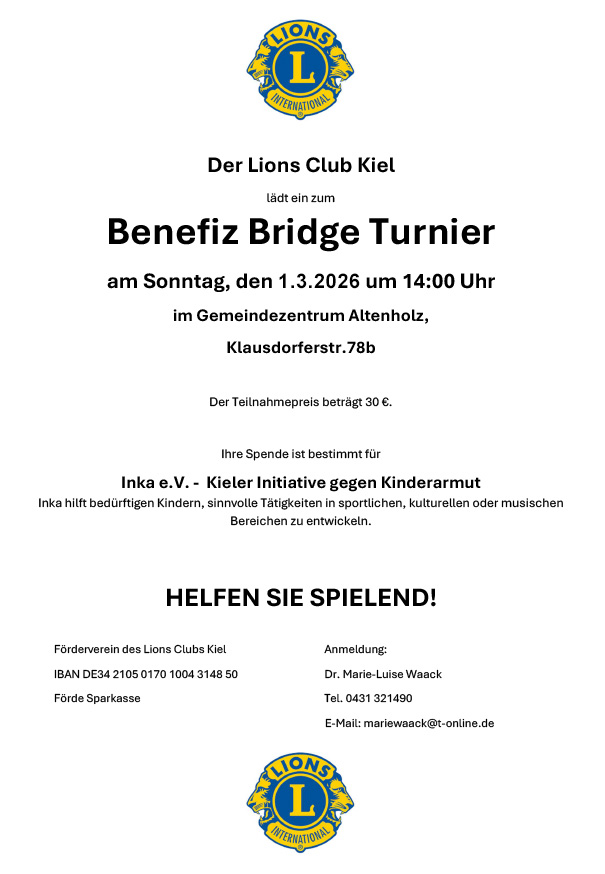 Der Lionsclub Kiel richtet zugunsten von inka am 1. März 2025 ab 14:00 Uhr im Gemeindezentrum Altenholz, Klausdorferstr. 78 b ein Bridge Turnier aus. Der Teilnahmepreis beträgt 30 €. Initiatorin und Organisatorin des Turniers ist Lionsfreundin Dr. Marie-Luise Waack. inka dankt Frau Dr. Waack sehr für diesen Einsatz.